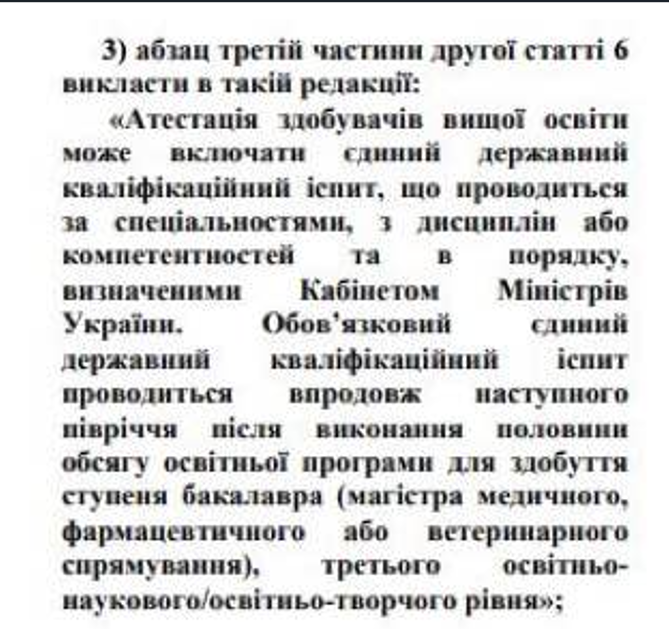 Министерство образования Украины решило узаконить проведение единого государственного квалификационного экзамена (аббревиатура на украинском языке ЄДКІ) для бакалавров, магистров и аспирантов. Такой экзамен будет проводиться после выполнения учащимися половины объема образовательной программы.