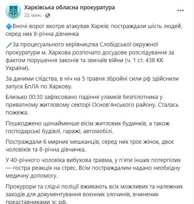 В ночь на 5 мая Россия атаковала Харьков с помощью БПЛА. Пострадали шесть человек, среди них 8-летняя девочка.