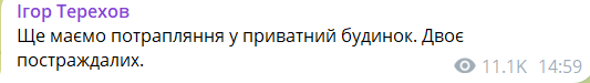 Также мэр Харькова Игорь Терехов сообщил о попадании в частный дом, пострадали два человека.