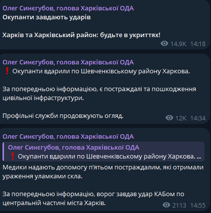"Медики оказывают помощь пяти пострадавшим, получившим поражение обломками стекла. По предварительной информации, враг нанес удар КАБом по центральной части города Харькова", - заявил Синегубов.