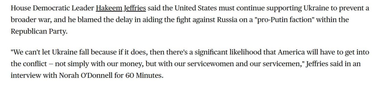 "Мы не можем позволить Украине пасть, потому что если это произойдет, то существует значительная вероятность того, что Америке придется ввязываться в конфликт - не просто с нашими деньгами, но с нашими военнослужащими", - сказал Джеффрис.