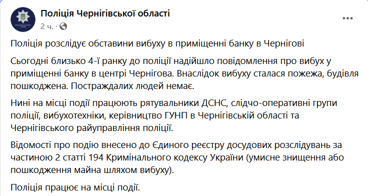 "Сегодня около 4 утра в полицию поступило сообщение о взрыве в помещении банка в центре Чернигова. В результате взрыва произошел пожар, здание повреждено. Пострадавших нет", - говорится в сообщении.