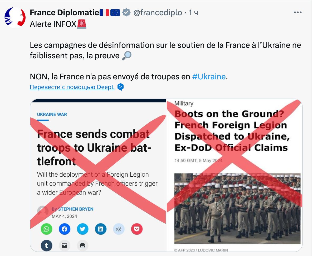"Кампании по дезинформации, касающиеся поддержки Францией Украины, не прекращаются. Нет, Франция не отправляла войска в Украину", — говорится в публикации.