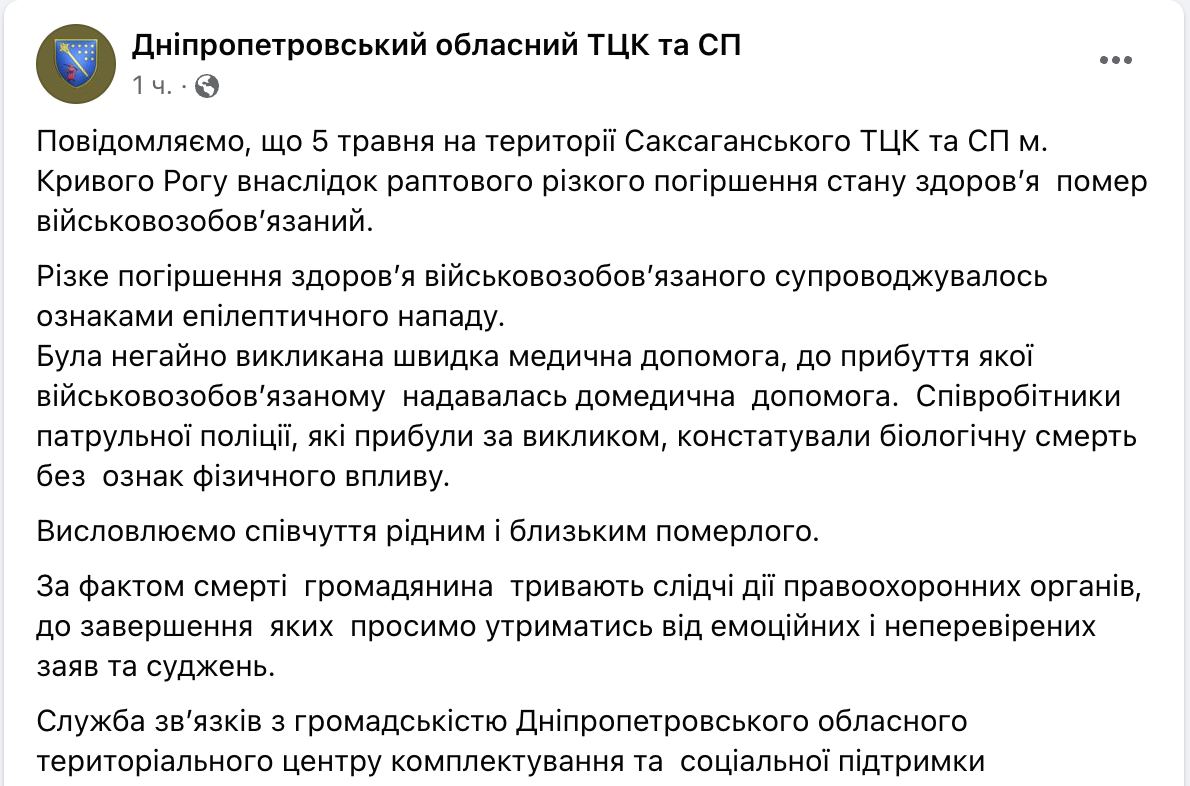 Появился официальный комментарий ТЦК Кривого Рога о смерти мужчины на их территории.