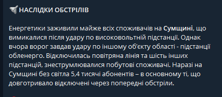 "Однако вчера враг нанес удар по другому объекту области – подстанции облэнерго. Отключилась воздушная линия и шесть других подстанций, обесточены бытовые потребители. Сейчас в Сумской области без света 5,4 тысячи абонентов – в основном те, что долго отключены из-за предыдущих обстрелов" - говорится в сообщении Минэнерго.