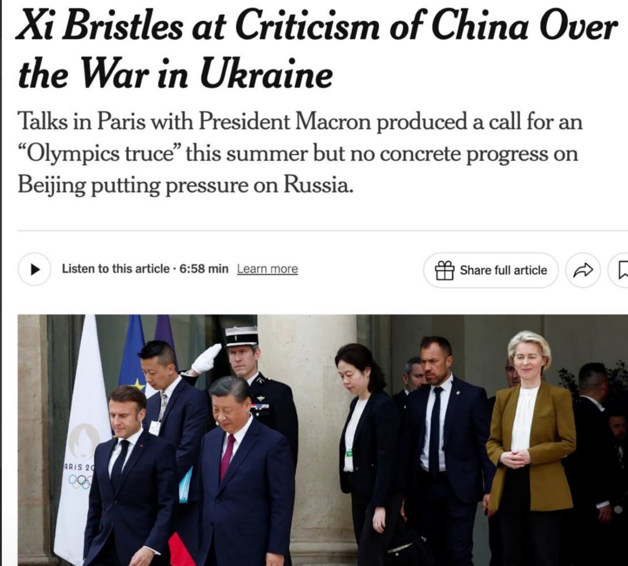 Президент Франции Эммануэль Макрон и глава Еврокомиссии Урсула фон дер Ляйен оказывали давление на лидера Китая, чтобы тот использовал свое влияние на Москву и положил конец войне. Но не было никаких намеков - кроме общего пожелания мира - на то, что он попросит своего союзника "без ограничений" прекратить войну.