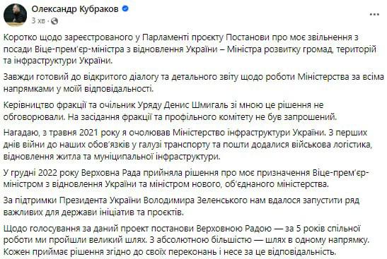 Сам Кубраков заявил, что с ним никто не обсуждал возможность увольнения. Даже премьер-министр Денис Шмыгаль ему об этом ничего не сообщил.