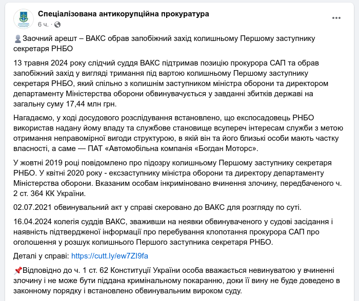 Об этом сообщает Специализированная антикоррупционная прокуратура на своей странице в Фейсбуке.