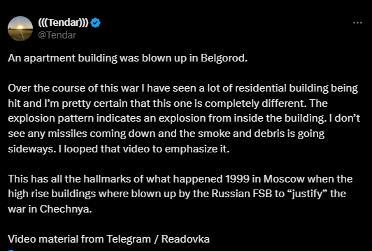 "В Белгороде взорвали жилой дом. В течение этой войны я видел много пораженных жилых домов, и я почти уверен, что это совсем другое. Схема взрыва указывает на взрыв изнутри здания", - написал эксперт.