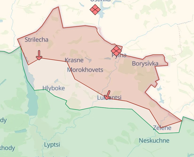 Следуя на Липцы, россияне, по данным телеграм-канала Deep State, захватили села Стрелечья, Пыльная, Борисовка, Красное, Мороховец, Олейниково, Зеленое и почти полностью - Лукьянцы.