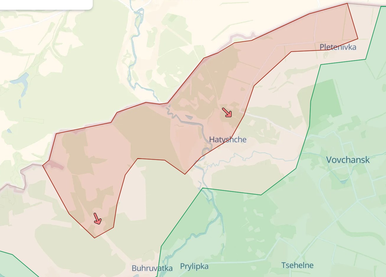На втором фланге атаки - в сторону Волчанска - захвачены села Плетеневка и Огурцово. По большей части захвачено Гатище, в серой зоне оказались деревни Старица и Бугроватка.