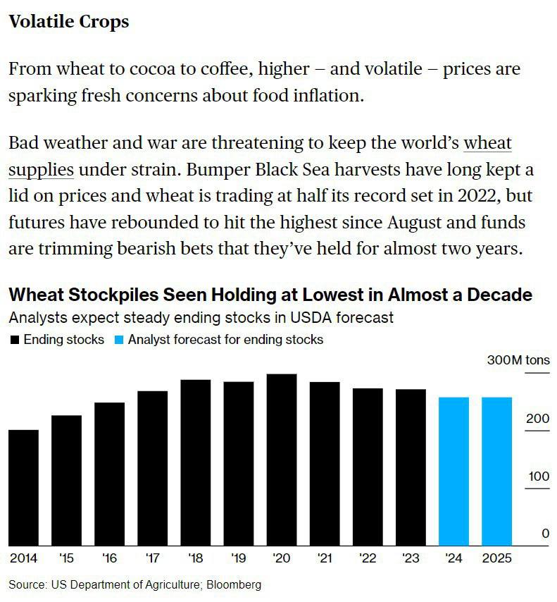 Очень хорошие урожаи в странах черноморского бассейна (в первую очередь, в Украине и в России) долгое время сдерживали мировые цены. И стоимость пшеницы оставалась вдвое ниже рекорда, установленного в 2022 году. Но сейчас фьючерсы достигли максимума с августа, сообщает Bloomberg.