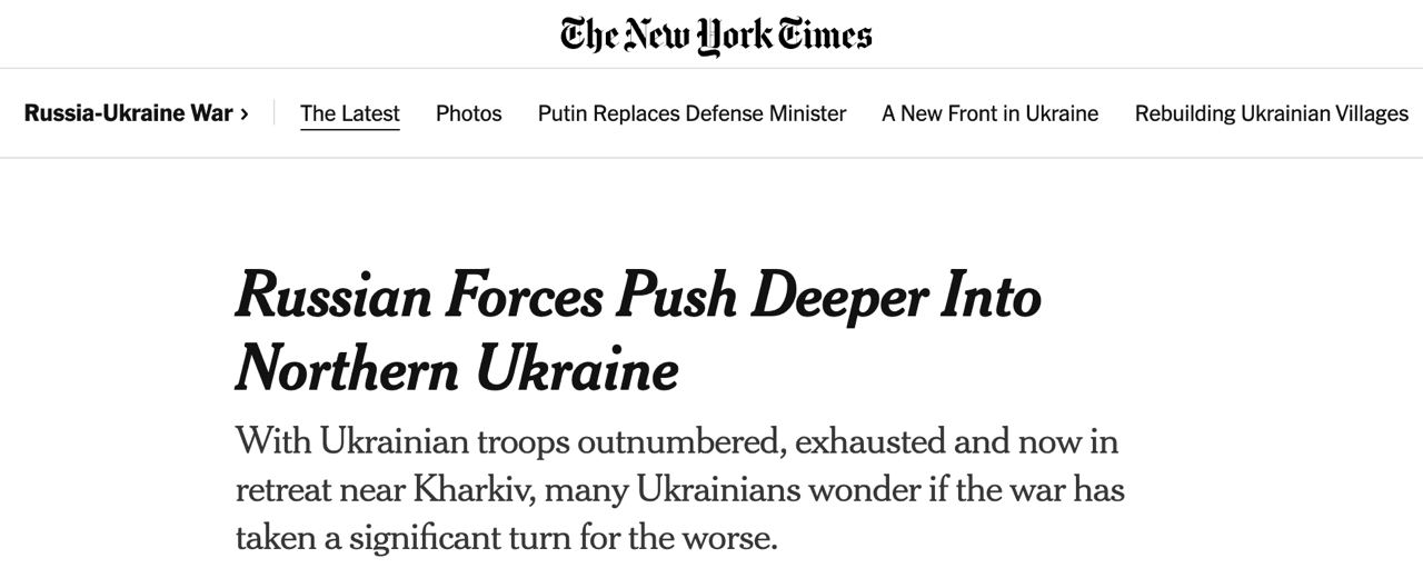 Текущее продвижение РФ в Харьковской области - самое быстрое за все время войны, кроме самого начала, подсчитали журналисты. По оценке аналитиков, РФ решила воспользоваться дефицитом боеприпасов и людей в ВСУ, растянув фронт и увеличив таким образом шансы на прорыв.