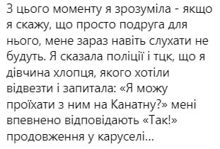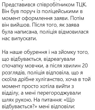 "Представился сотрудником ТЦК. Он был рядом с полицейскими в момент оформления заявления. Затем он вышел. После того, как заявление было написано, полиция отказалась выпускать нас", – рассказала девушка.