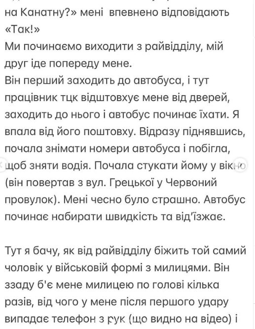 После этого парня повезли в ТЦК, а девушка начала снимать на видео водителя отъезжающего автомобиля. В это время из отделения полиции выскочил военный с костылем и избил ее.