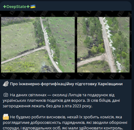 "На данных фотографиях — окрестности Липцев и подарок от украинских налогоплательщиков для врага. По словам бойцов, данные заграждения лежат без дела с лета 2023 года. Не будем делать выводы, пусть их сделает комиссия, которая будет рассматривать добросовестность подрядчиков, возводивших оборонительные сооружения, и ответственных лиц, которые должны осуществлять контроль", - говорится в публикации ресурса.