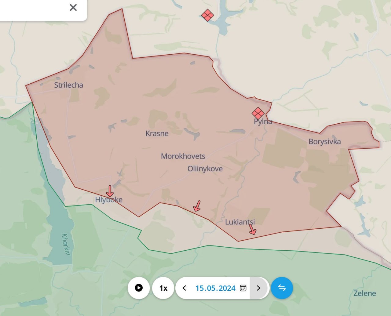 Судя по карте ресурса, россияне закрепились к северу от Волчанска на участке Гатище - Плетеневка, а также на северной окраине самого города.