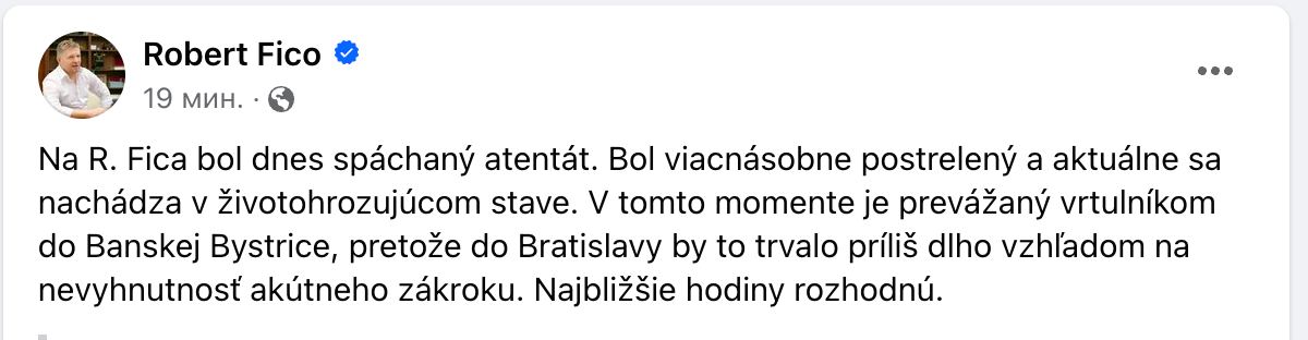 На странице Фицо в Фейсбуке официально заявили, что он находится "в опасном для жизни состоянии" и "получил множественные ранения".