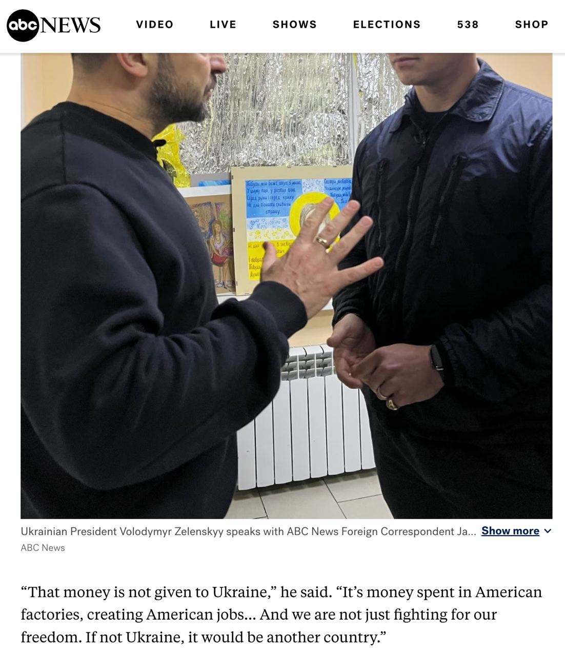 В этом же интервью Зеленский снова заявил, что выделенные Киеву американские деньги не попадают в Украину, а сразу идут в экономику США.