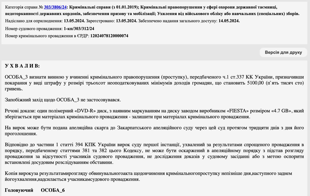 Мукачевский горрайонный суд оштрафовал женщину с медицинским образованием на 5100 гривен за неявку после получения предупреждения от руководителя ТЦК.