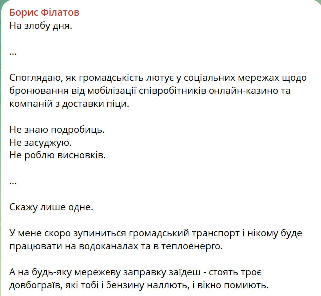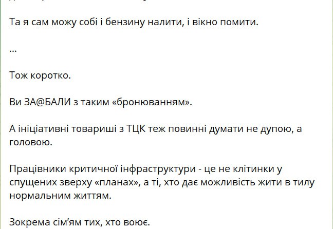 "У меня скоро остановится общественный транспорт и некому будет работать на водоканалах и теплоэнерго… Инициативные товарищи по ТЦК тоже должны думать не задницей, а головой. Работники критической инфраструктуры – это не ячейки в спущенных сверху "планах", а те, кто дают возможность жить в тылу нормальной жизнью", – написал мэр Днепра.