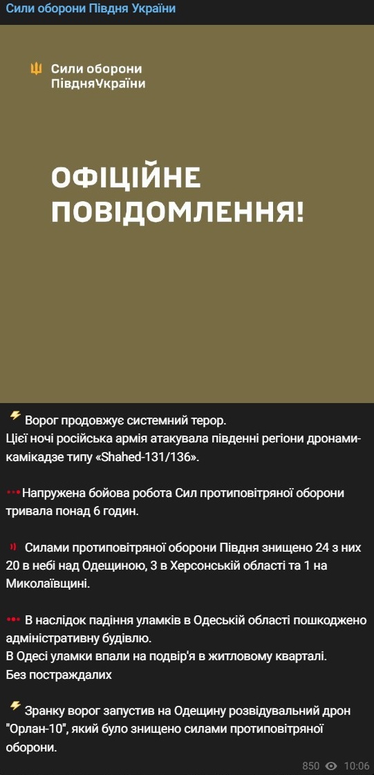 11:22 Сегодня ночью российская армия атаковала южные регионы дронами-камикадзе типа "Shahed-131/136". В Одесской области сбили 20 "Шахедов", 3 в Херсонской и 1 в Николаевской. Боевая работа продлилась более 6 часов.
