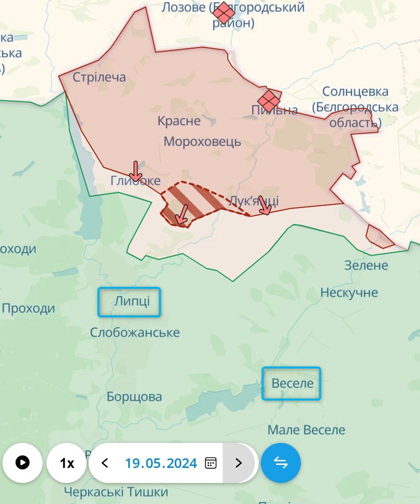 К западу от Волчанска россияне заняли новые территории на правом берегу Северского Донца, севернее недавно захваченной Бугроватки. Россияне говорят, что РФ атакует село Прилипка к западу от Волчанска, пытаясь прорваться на левый берег Донца и приблизиться к частичному окружению Волчанска.