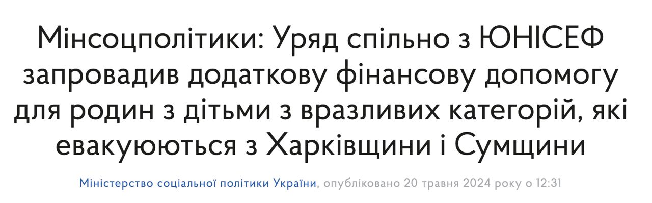 15:59 Семьи с детьми из уязвимых категорий, которые эвакуируются из Харьковской и Сумской областей, получат дополнительные выплаты от ЮНИСЕФ - по 10 800 грн на каждого члена семьи.