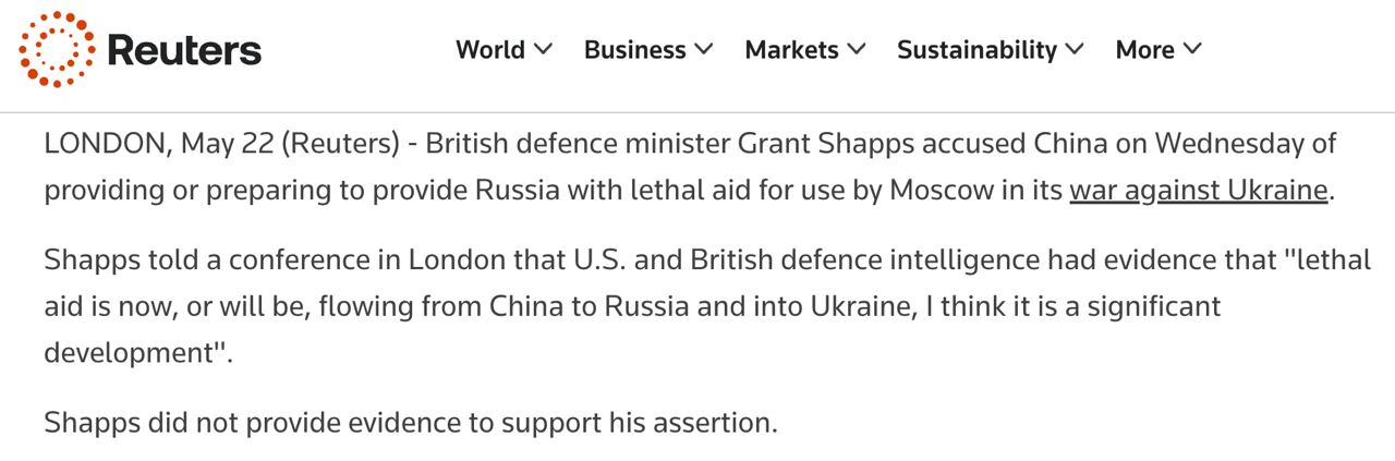 "Шэппс заявил на конференции в Лондоне, что у американской и британской военной разведки есть доказательства того, что "«летальная помощь уже поступает или будет поступать из Китая в Россию и в Украину", - пишет Reuters.
