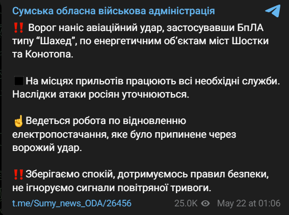 "Враг нанес авиационный удар, применив БПЛА типа "Шахед", по энергетическим объектам городов Шостки и Конотопа", - говорится в сообщении.