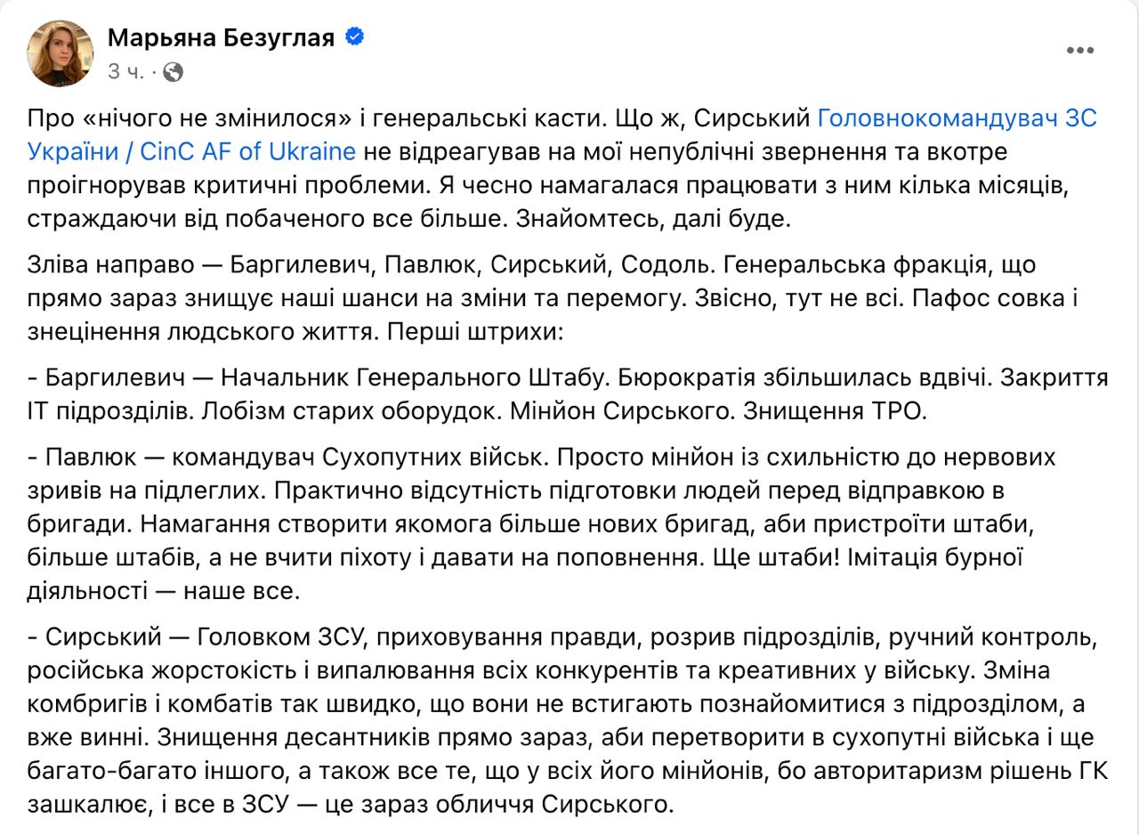 • Начальника Генштаба Анатолия Баргилевича назвала "миньоном Сырского", обвинив в том, что "бюрократия увеличилась вдвое", были закрыты ИТ-подразделения, происходит "лоббизм старых сделок", "уничтожение ТРО".