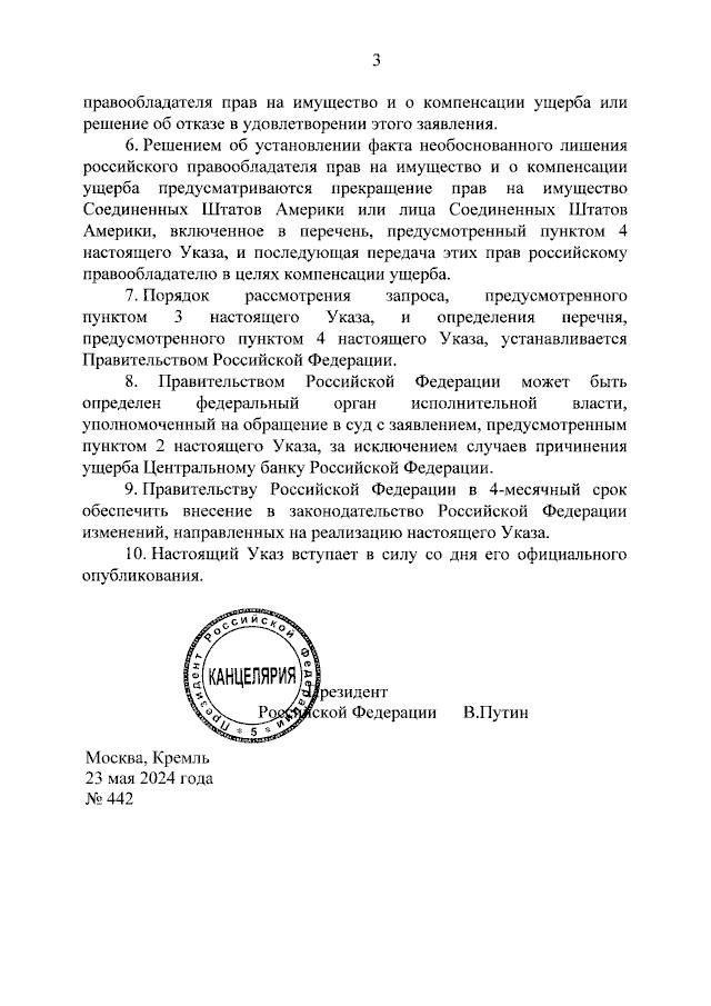 "Российский правообладатель вправе обратиться в суд в соответствии с правилами подсудности <...> с заявлением об установлении факта необоснованного лишения его прав на имущество в связи с решением государственного или судебного органа Соединенных Штатов Америки и о компенсации ущерба", — сказано в указе.