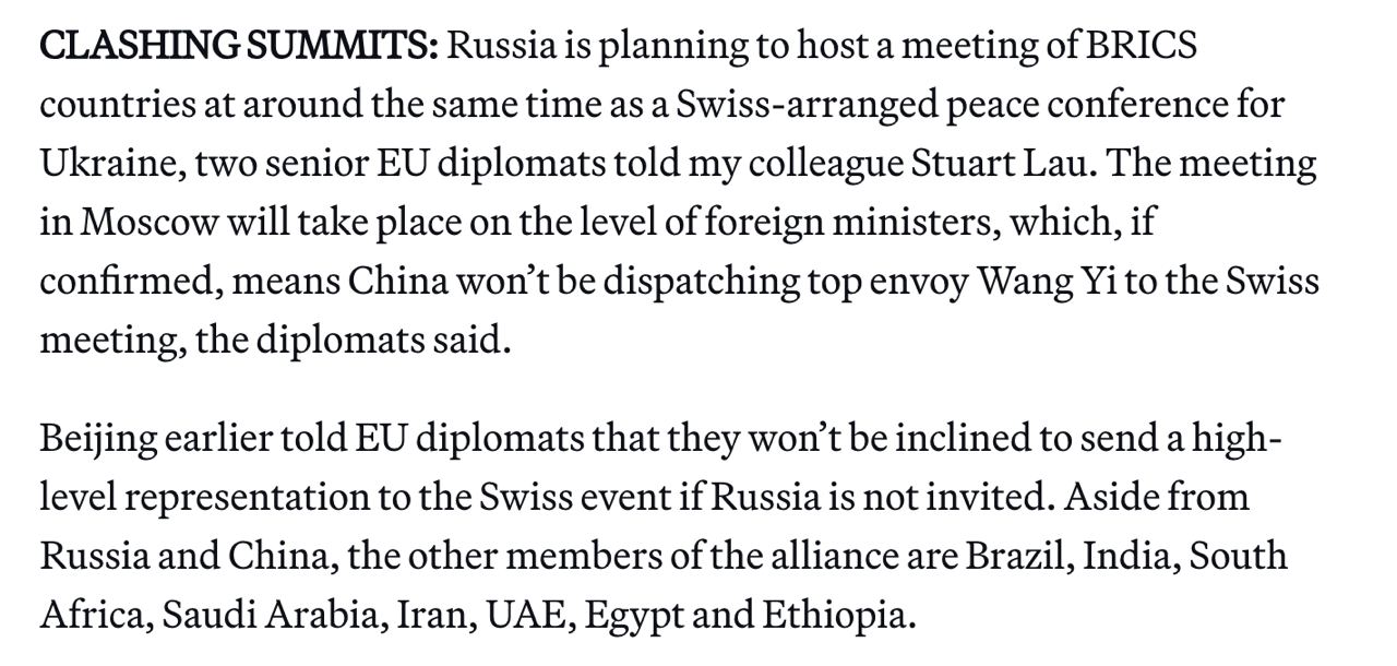 "Россия планирует провести встречу стран БРИКС примерно в то же время, что и организованная Швейцарией мирная конференция по Украине, рассказали два высокопоставленных дипломата ЕС. Встреча в Москве пройдет на уровне министров иностранных дел. Если информация подтвердится, это будет означать, что Китай не отправит Вана И на швейцарскую встречу, заявили дипломаты", - пишет издание.
