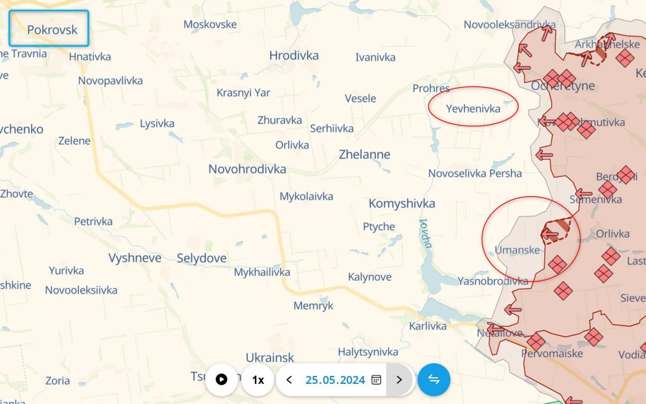 Генштаб ВСУ пишет, что под Очеретино россияне имеют частичный успех восточнее Евгеньевки, и украинские войска "принимают активные меры по восстановлению утраченного положения". Это также движение на запад, в сторону Покровска.