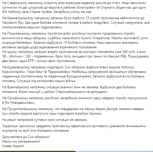 "В настоящее время продолжаются бои вблизи Новоегоровки, Петропавловки и Ивановки. На двух последних участках враг имеет частичный успех, ситуация напряжена. Силами обороны Украины принимаются активные меры по стабилизации обстановки", - говорится в сводке.
