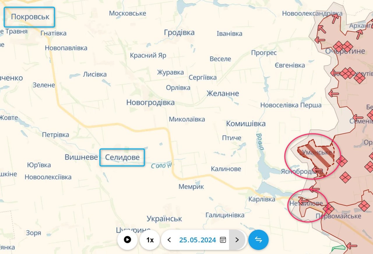 Вчера паблик Deep State сообщил о потере Уманского на Авдеевском направлении. Власти Украины этого не подтверждали. Генштаб вчера сообщал о штурмах в районе Уманского.
