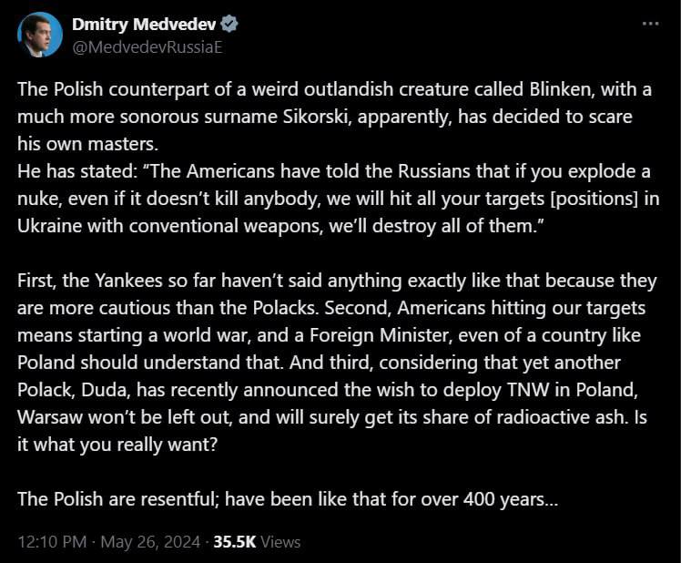 "Во-первых, янки пока ничего подобного не говорили, потому что они более осторожны, чем поляки. Во-вторых, поражение американцами наших целей означает начало мировой войны, и министр иностранных дел, даже такой страны, как Польша, должен это понимать. И в-третьих, учитывая, что о желании разместить ТЯО в Польше недавно заявил еще один поляк Дуда, Варшава не останется в стороне и наверняка получит свою долю радиоактивного пепла", - угрожает Медведев.