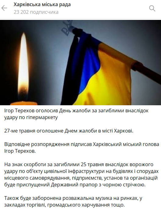 Понедельник, 27 мая, в Харькове объявлен днем траура по погибшим в результате авиаударов по строительному гипермаркету "Эпицентр". Соответствующее распоряжение подписал мэр города Игорь Терехов.