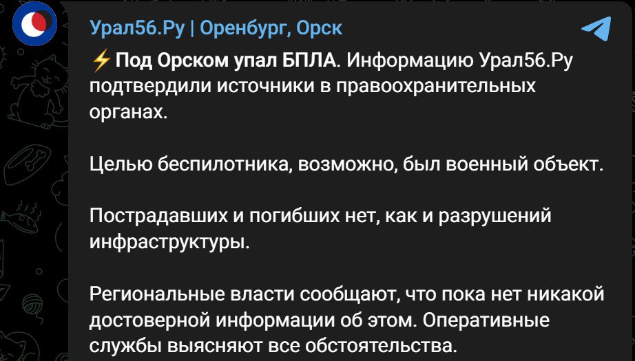 Ночью российские паблики сообщили, что украинский дрон атаковал военный объект в городе Орске под Оренбургом. Это порядка 1800 километров от украинской границы.
