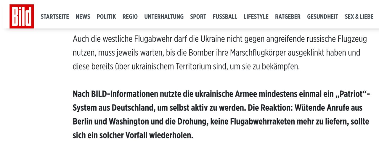 ВСУ как минимум один раз использовали поставленную Германией американскую систему ПВО Patriot для ударов пор российской территории.