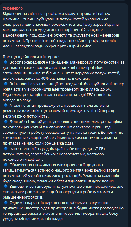 Также уничтожены до 40% (более 8 ГВт) маневровых мощностей, с помощью которых покрывались утренние и вечерние пики потребления.