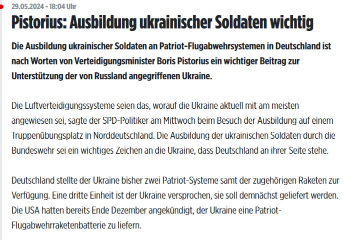 Писториус отметил, что, по оценке Берлина, тренировка украинских военных на территории Украины неоправданна.