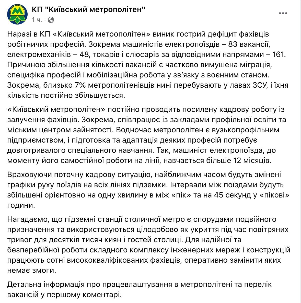 Людей не хватает, в частности, из-за мобилизации. В ВСУ призвали 7% сотрудников метрополитена. Открыты 83 вакансии на машинистов электропоезда и десятки на других позициях.
