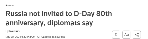 Ранее сообщалось, что Франция пригласила Россию на 80-ю годовщину высадки союзников в Нормандии. Позже стало известно, что российское посольство во Франции не получало приглашения на празднование 80-летия высадки в Нормандии.
