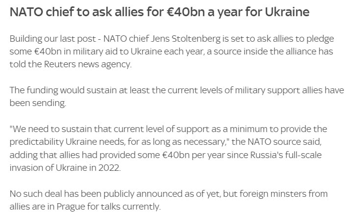"Нам необходимо поддерживать нынешний уровень поддержки как минимум, чтобы обеспечить предсказуемость, в которой нуждается Украина, так долго, как это необходимо", — сказал источник в НАТО, добавив, что союзники предоставляли около 40 миллиардов евро в год с момента начала войны.