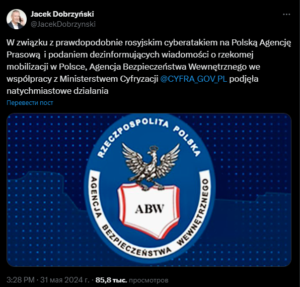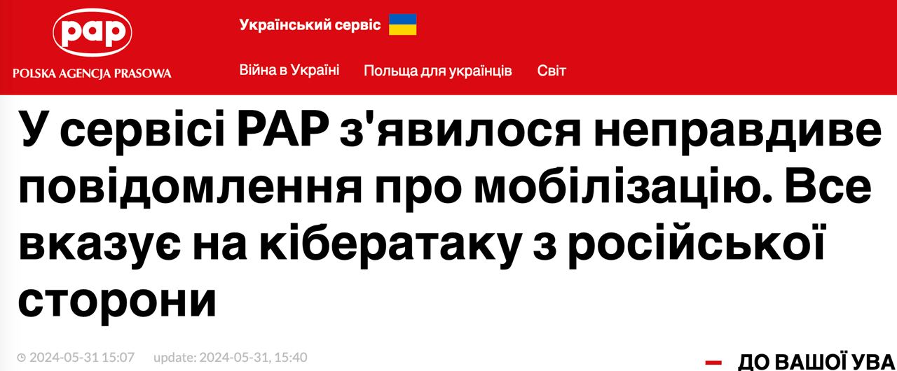 Днём 31 мая на новостном сервисе Polska Agencja Prasowa появилась новость с якобы заявлением премьер-министра Дональда Туска о частичной мобилизации в Польше с 1 июля и отправке мобилизованных на войну в Украину. Фейковая новость начиналась с упоминания о предстоящем саммите мира в Швейцарии и утверждения, что "война в Украине вошла в тяжёлую фазу".