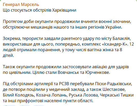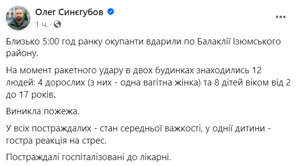 Сегодня утром российские войска ударили по Балаклее Изюмского района. Пострадали 12 человек, среди них восемь детей.