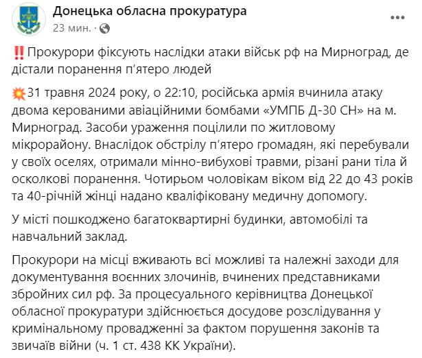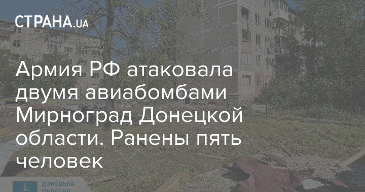 Вчера вечером российская армия атаковала двумя управляемыми авиационными бомбами Мирноград Донецкой области. Ранены пять человек, пострадало учебное заведение.