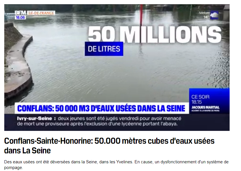 Жители коммуны Конфлан-Сент-Онорин жаловались властям о стекающей в реку "коричневой зловонной воде со всевозможными отходами вроде прокладок и салфеток".