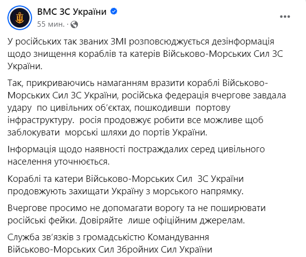 "Так, прикрываясь попыткой поразить корабли ВМС ВС Украины, российская федерация в очередной раз нанесла удар по гражданским объектам, повредив портовую инфраструктуру. россия продолжает делать все возможное, чтобы заблокировать морские пути в порты Украины", - говорится в сообщении.